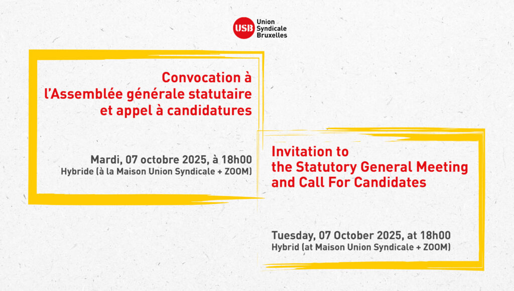 Une nouvelle assemblée générale statutaire (AG) doit être convoquée. Le 9 septembre 2025, l’AG n’a pas été en mesure de nommer le bureau électoral en raison d’un nombre insuffisant de candidats (au moins sept, issus de trois institutions différentes). Par conséquent, le Comité exécutif (CE) a décidé, conformément à nos STATUTS, de reconvoquer une Assemblée générale statutaire le mardi 7 octobre 2025 à 18h00. Cette réunion sera hybride (en présentiel à la Maison Union Syndicale et via Zoom).