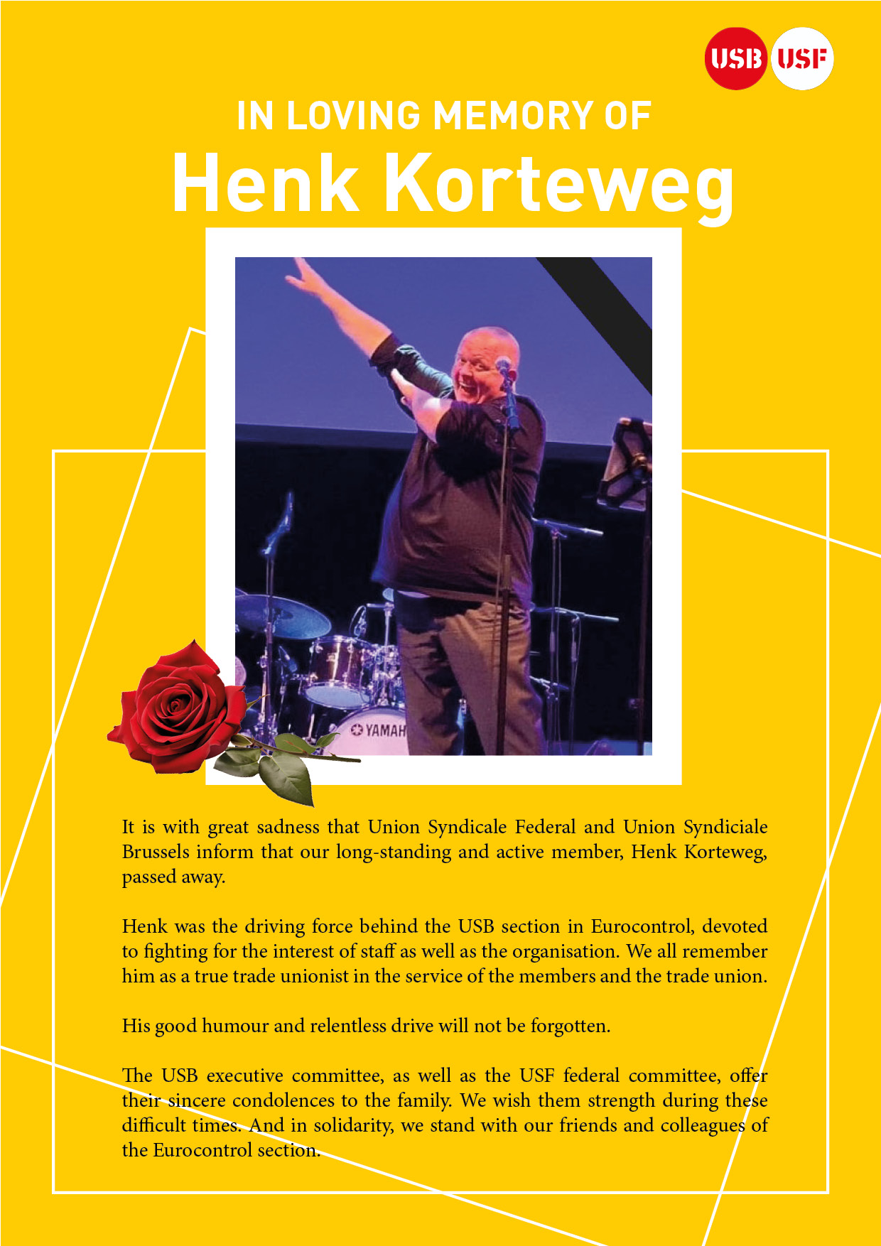 Henk was the driving force behind the USB section in Eurocontrol, devoted to fighting for the interest of staff as well as the organisation. We all remember him as a true trade unionist in the service of the members and the trade union.